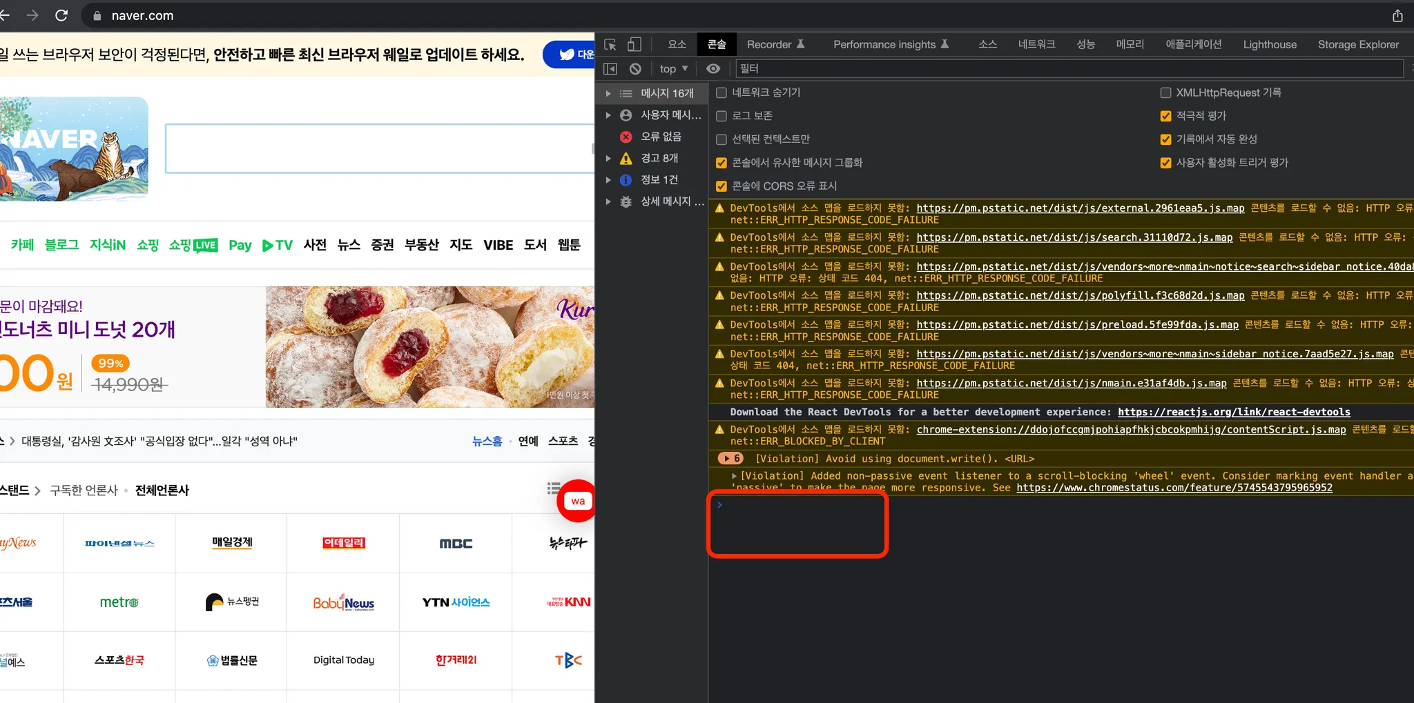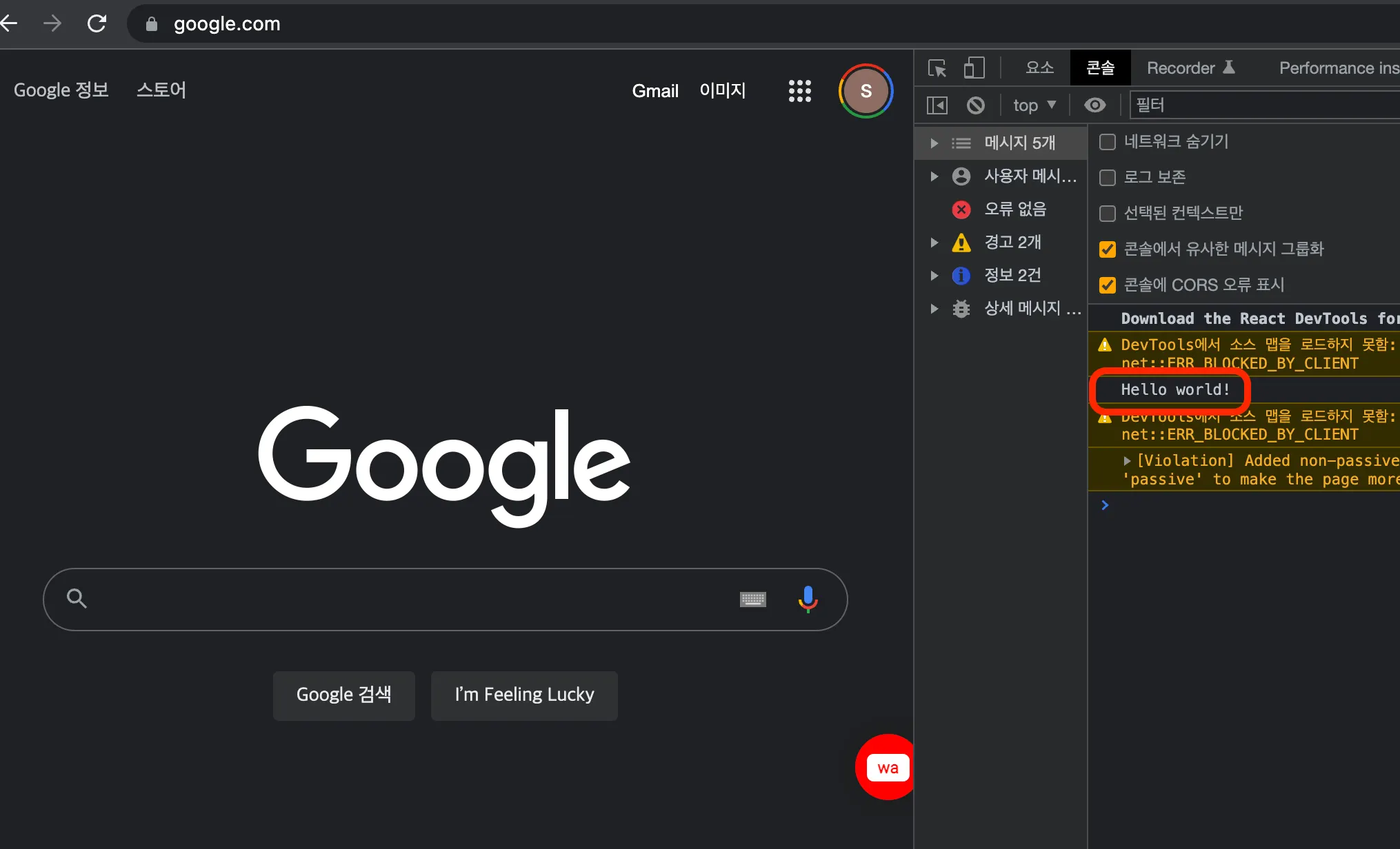 아래 사진을 보면 각각의 script들이 기대한 대로 동작하는 것을 확인할 수 있다. google에서는 hello world!가 출력되고 naver에서는 아무것도 출력이 되지 않는 것을 확인할 수 있다.