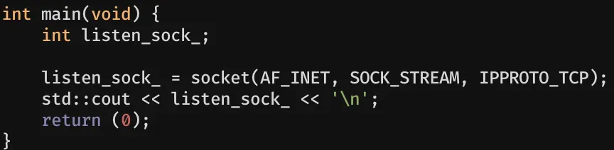 소켓 디스크립터는 Linux나 macOS 환경에서 파일 디스크립터(FD)와 같이 관리된다. main문에서 바로 socket() 함수를 실행해서 반환값을 보면 3인 것을 확인할 수 있다. 이는 사용할 수 있는 FD가 STDIN(0), STDOUT(1), STDERR(2) 바로 다음 값인 3이기 때문이다.