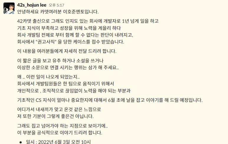 그러나 해당 케이스 경우 역량이 안올라와서 권고사직함