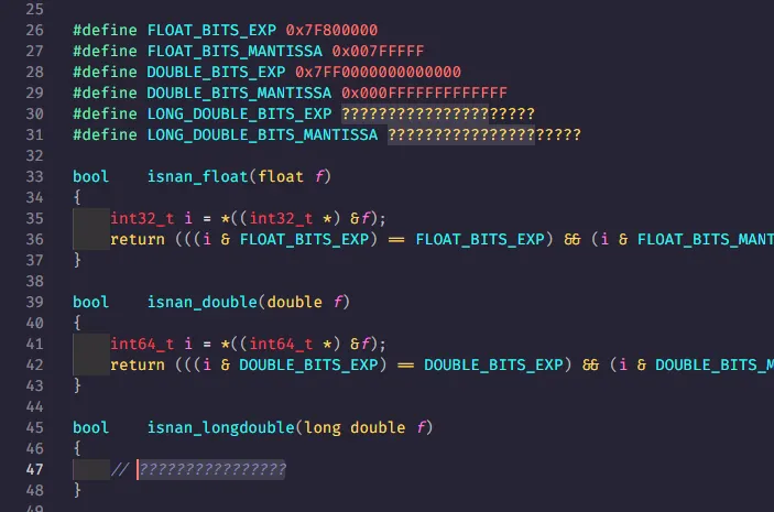 비트연산을 사용한 isnan 구현 예시, long double에 대해서는 불가능