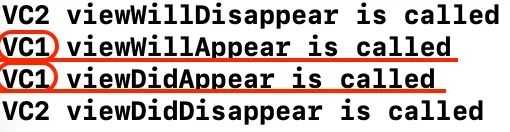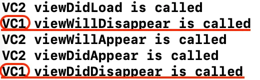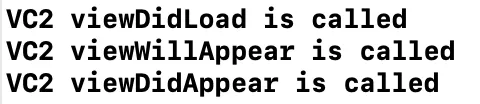 VC2가 로드되어 화면에 나오게 되므로 VC2의 viewDidLoad, viewWillAppear, viewDidAppear가 차례로 호출