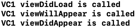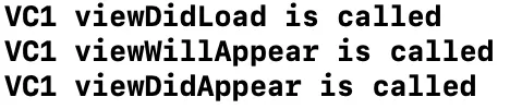 VC1이 로드되어 화면에 나오게 되므로 VC1의 viewDidLoad, viewWillAppear, viewDidAppear가 차례로 호출