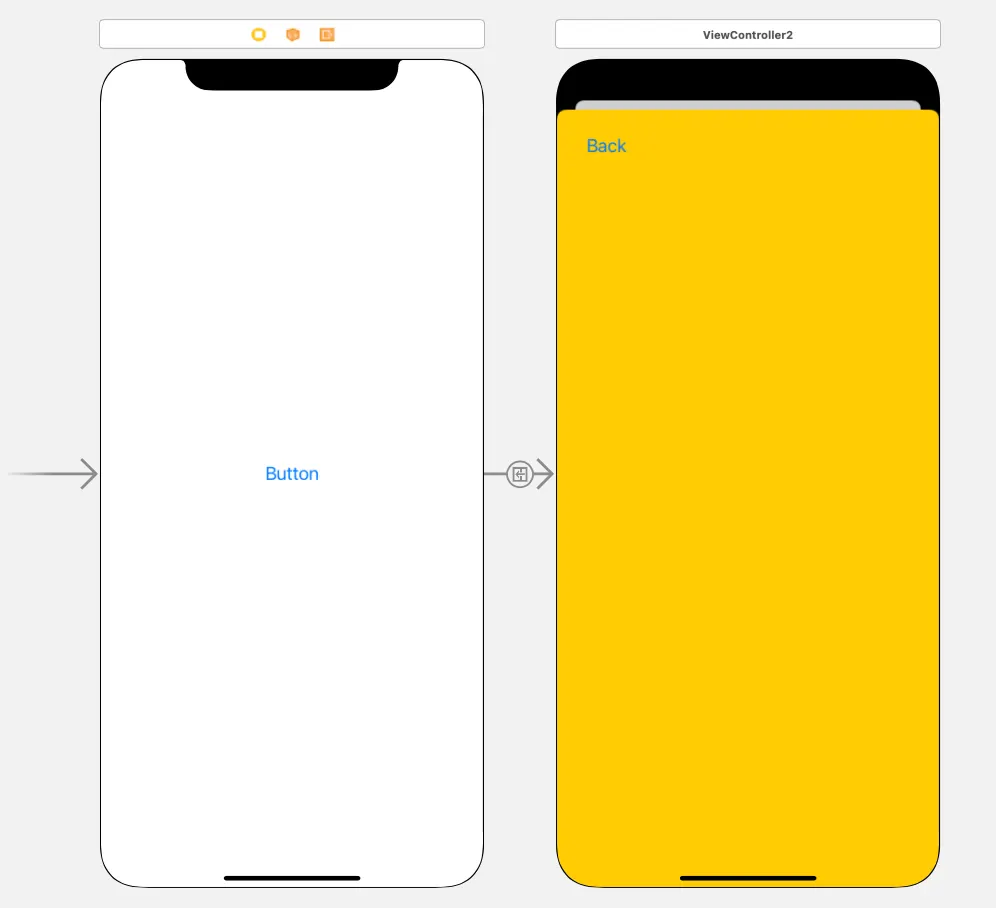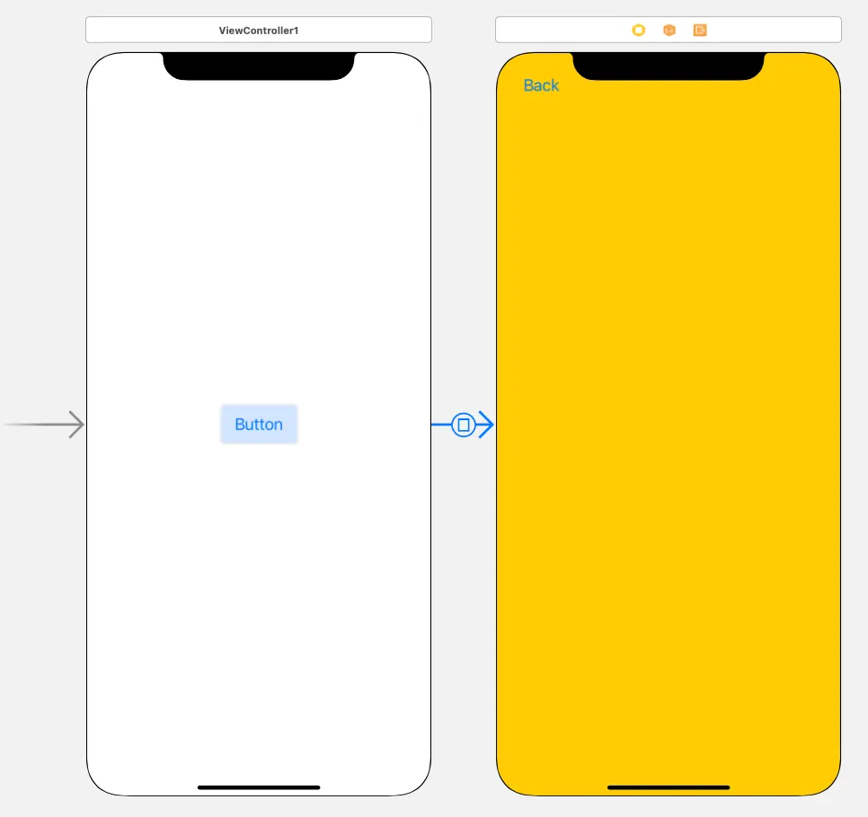 Button = ViewController2로 넘어가는 버튼. Kind: show(push)