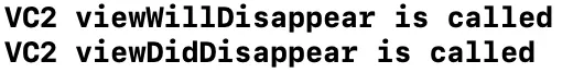 VC2가 화면에서 사라지기 때문에 VC2의 viewWillDisappear, viewDidDisappear가 차례로 호출