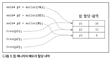 <그림 1>처럼 힙 관리자는 메모리 블록을 할당할 때마다 메모리 할당 내역을 저장하게 된다. 그림의 할당 내역 테이블에는 p1, p2, p3처럼 이름이 들어가 있지만, 실제로는 p1, p2, p3의 메모리 주소 가 들어가게 된다. free를 호출하게 될 경우 힙 관리자는 인자로 넘 어온 메모리 주소를 할당 내역에서 검색해 존재할 경우 할당된 크기만큼 해당 메모리 블록을 해제하고, 할당 내역에서 삭제한다.