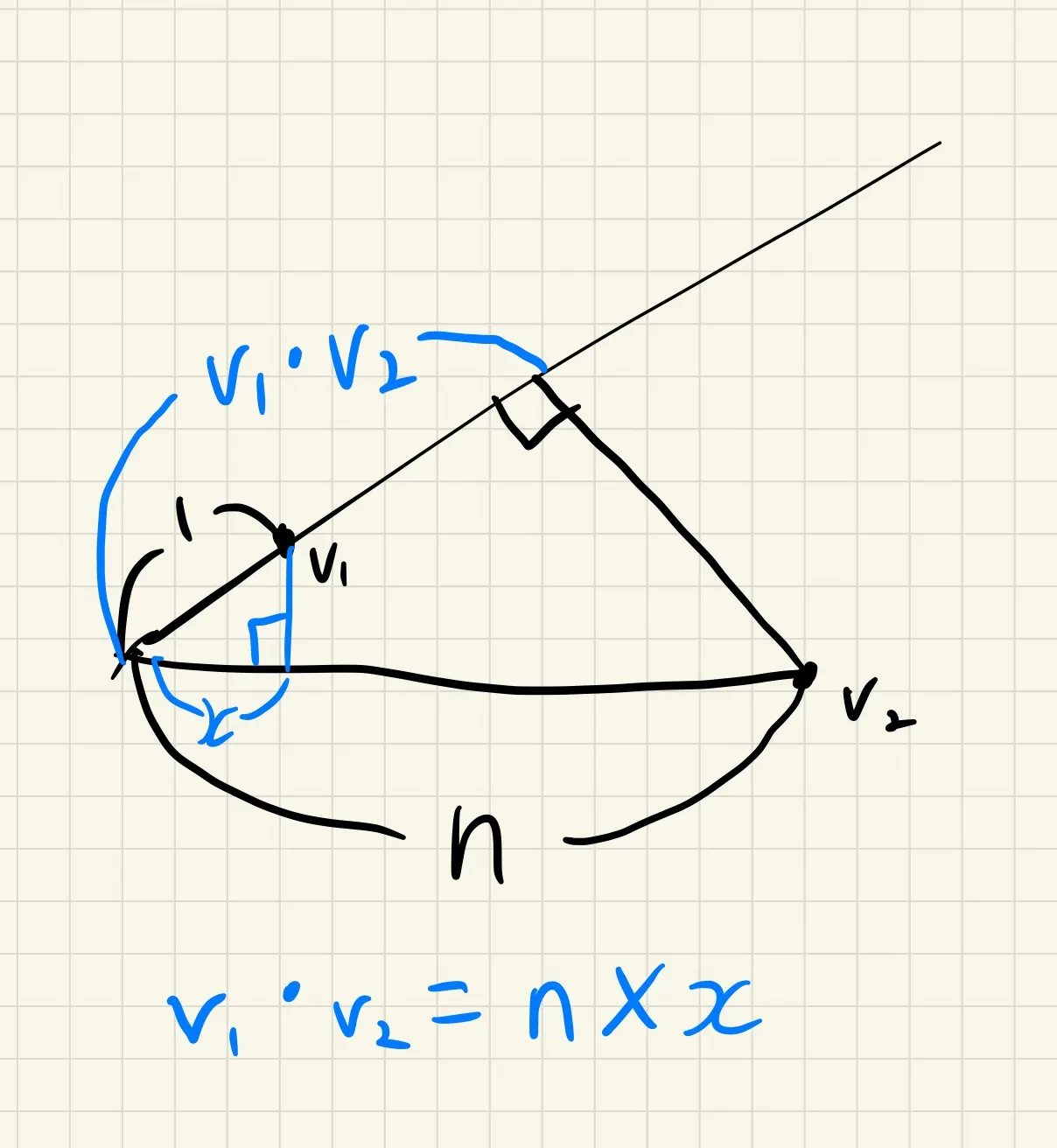 두 벡터의 내적은 각 두 벡터 길이, 그 사잇각의 코사인을 곱한 것과 같다는 법칙입니다.