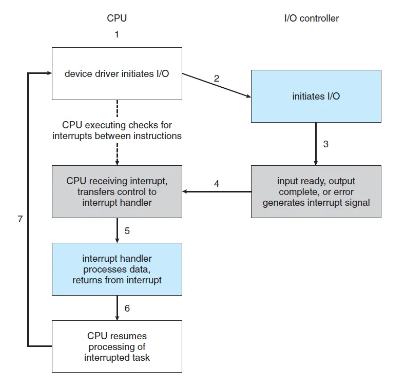 짧은 입출력 마다 인터럽트가 발생하면 CPU가 입출력 처리에 많은 시간을 할애하게 되어 오버헤드를 유발할 수 있다. 이 문제를 해결하기 위해 직접 메모리 엑세스(DMA)가 사용된다. 장치제어기는 CPU의 개입 없이 메모리로부터 자신의 버퍼로 혹은 버퍼로부터 메모리로 데이터블록 전체를 전송한다. 한 바이트마다 인터럽트가 발생하는 것이 아니라 블록 전송이 완료될 때마다 인터럽트가 발생한다. 장치 컨트롤러가 전송 작업을 수행하고 있는 동안 CPU는 다른 작업을 수행할 수 있다.