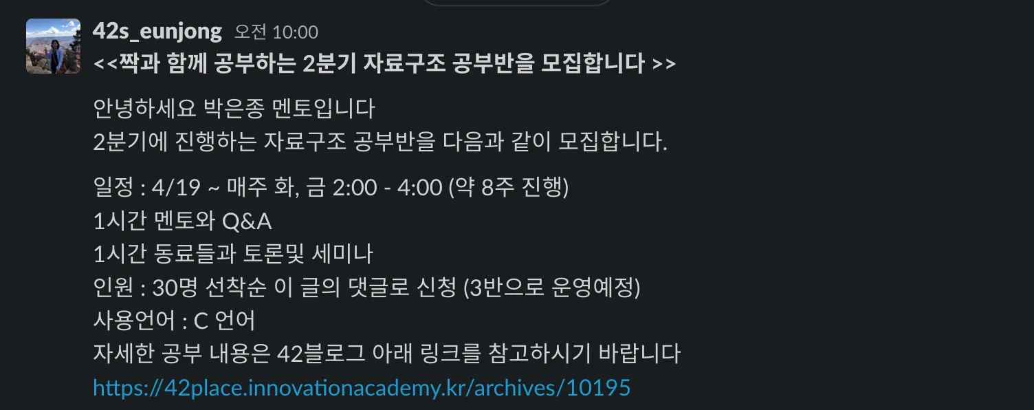 그러다 우연히 42서울 슬랙 채널에서 박은종 멘토님께서 운영하시는 “자료구조 스터디" 모집 게시물을 보았다.