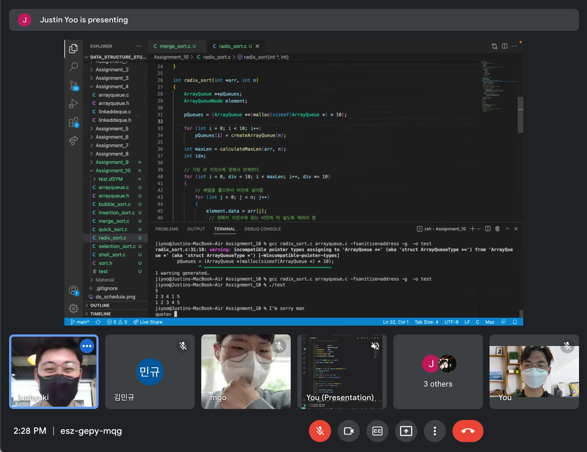 온라인으로 진행하는 경우에는 Visual Studio Code 의 확장 기능인 Live Share 를 활용하여 동시에 코드 편집을 하고, 터미널 실행 결과를 함께 공유했다. 다만, 온라인으로 진행하는 경우에는 상대방에게 나의 목소리가 잘 전달될 수 있도록 조용한 환경에서 마이크를 사용했다. 카페와 같이 주변 소음이 많은 곳보다는 주로 집에서 진행했다.