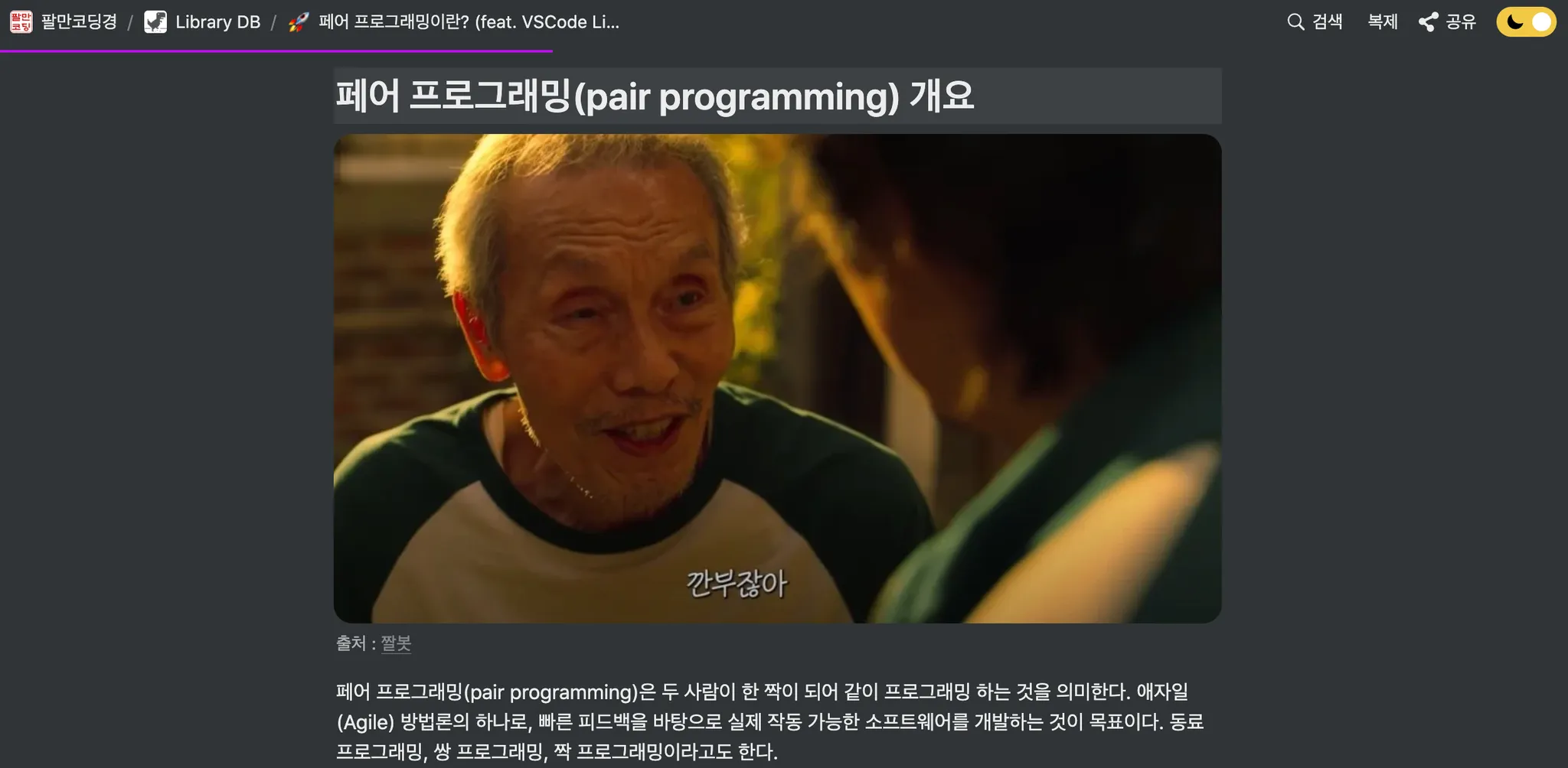 그리고 페어 프로그래밍의 효과를 온전히 적용하기 위해 42서울 공식 동아리인 <팔만코딩경>에 페어 프로그래밍에 대한 전반적인 지식을 정리하여 게시했다. (참고자료 : 페어 프로그래밍이란? (feat. VSCode Live Share))