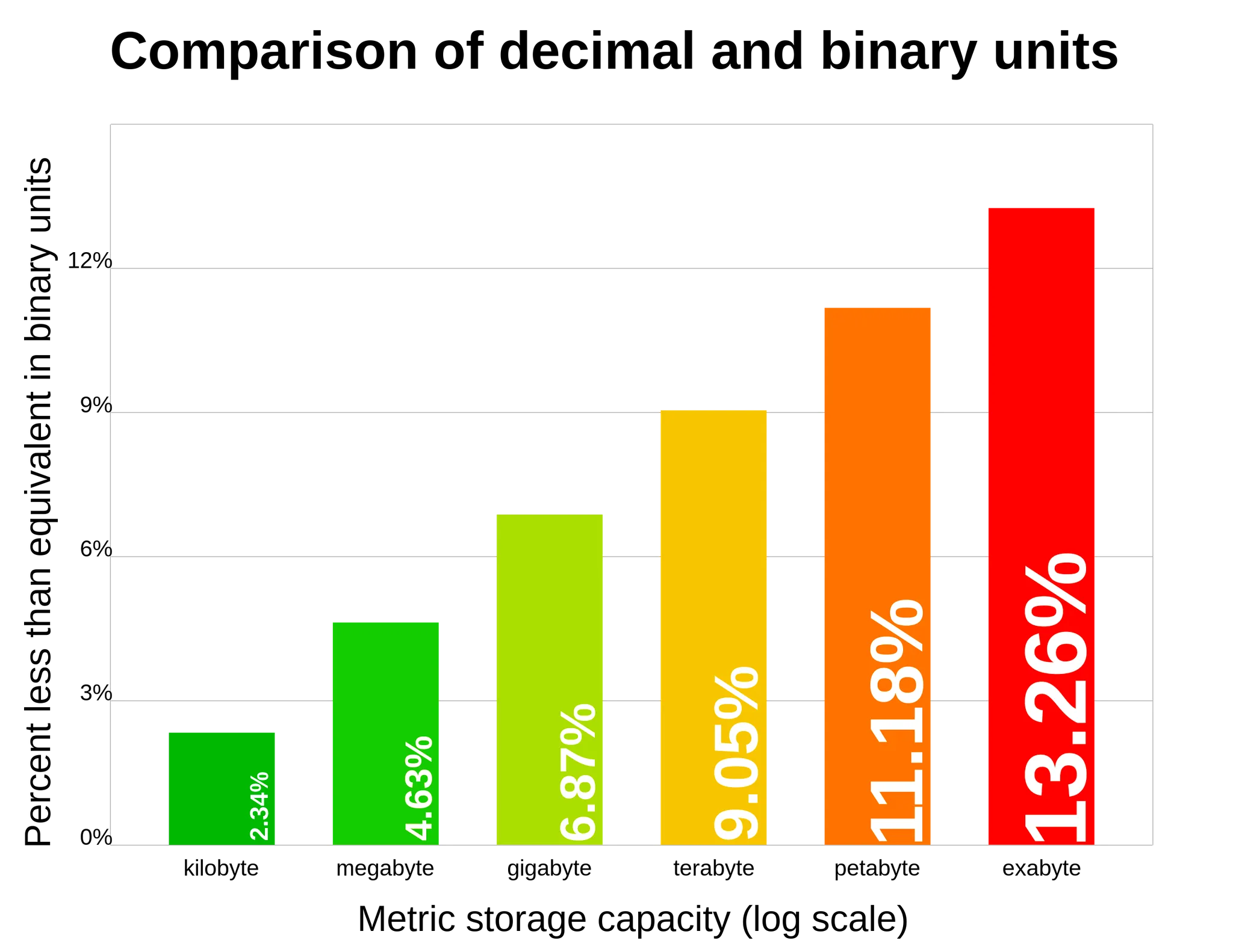 가령, 제품 생산자는 1 테라바이트를 1000GB로 생각하고 판매를 했는데, 소비자는 1 테라바이트를 1024GB라고 생각하고 구매했다고 하자. 이 때 발생하는 괴리는 무려 24GB로 적지않은 용량이 된다.