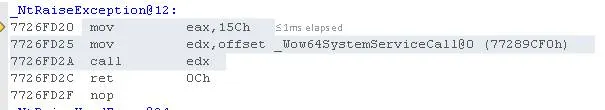 그리고 Throw 부분을 보면 NtRaiseException 시스템 서비스를 호출한다.
