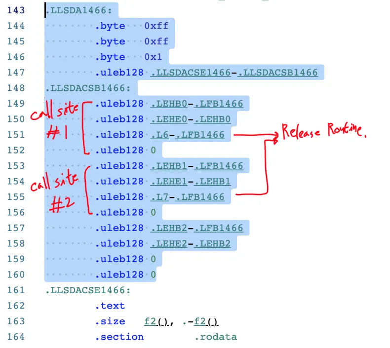 그래서 각 call site에 대한 주소 범위와 해제 루틴도 컴파일 테이블에 추가된다!