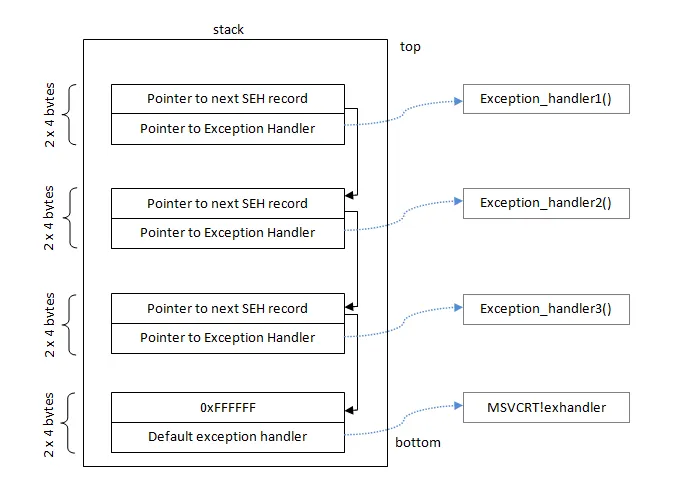 매 함수 프레임마다 별도의 Exception Handler에 대한 정보를 기록하여