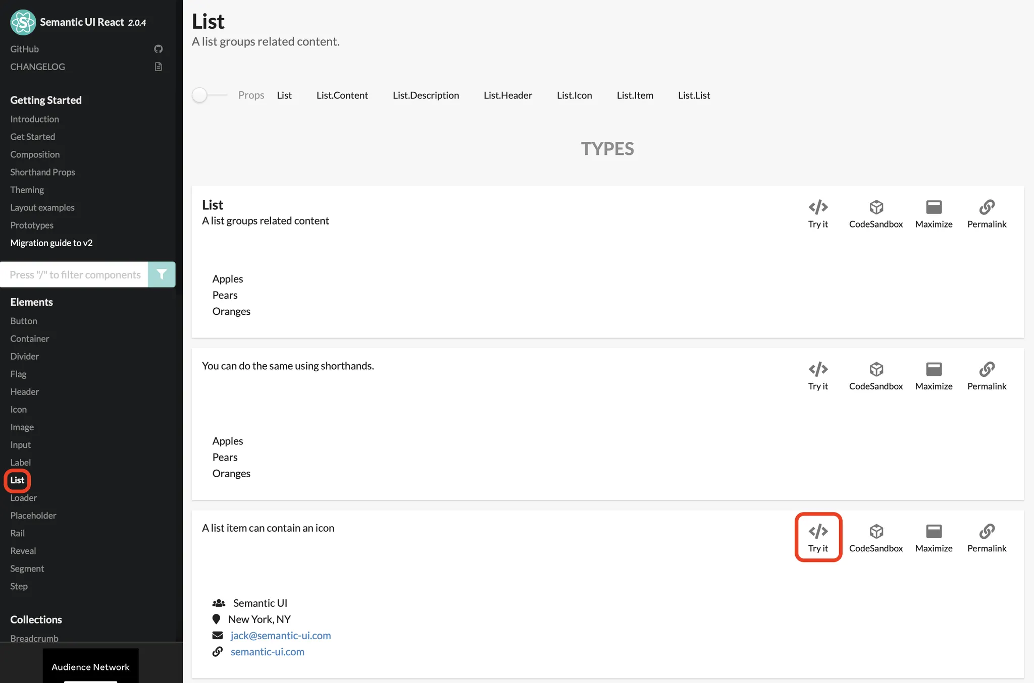 만약 리스트를 넣고싶다면, 목록에서 리스트를 고른 후, 마음에 드는 형태의 리스트를 고른다. 이후 Try it 버튼을 눌러 코드 샘플을 보자!