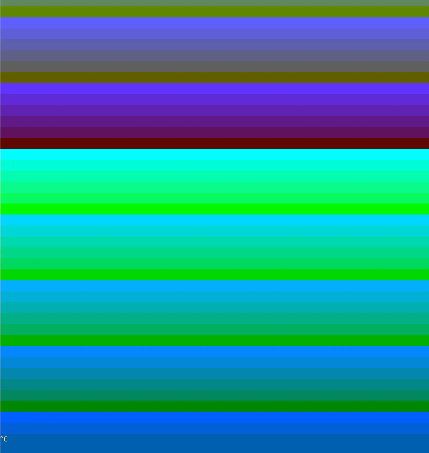 x1b[48;5;[n]m\n 은 배경색을 출력하는 코드이다. n의 범위는 0부터 255까지이며, 0부터 15는 기본 컬러 테이블, 232부터 255는 그레이스케일 컬러 테이블, 중간의 숫자들은 256 컬러 테이블이다. 참고로 \x1b[38;5;[n]m\n 은 글자색을 출력하는 코드로, 글자에 특정한 색을 입히고자 한다면, printf "\x1b[38;5;53mHello\n" 와 같이 입력하면 된다.