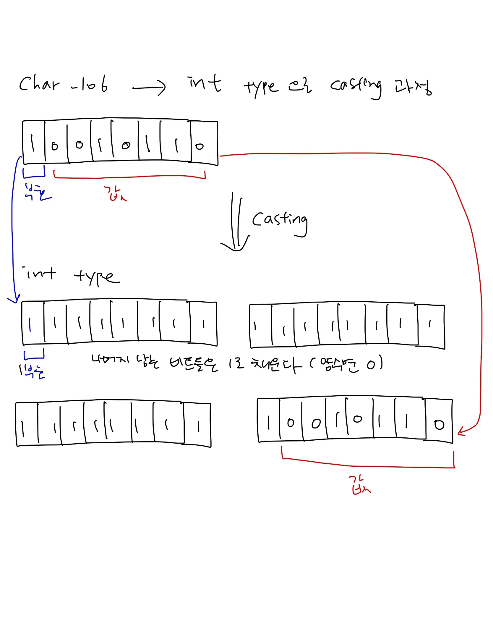 char형도 부호를 가지기 때문에 char형이 int형으로 변환될 때 가장 먼저 부호비트를 가져온다. 그리고 남는 자리에는 부호비트와 똑같은 비트로 채우고 데이터를 판별하는 값을 채운다.