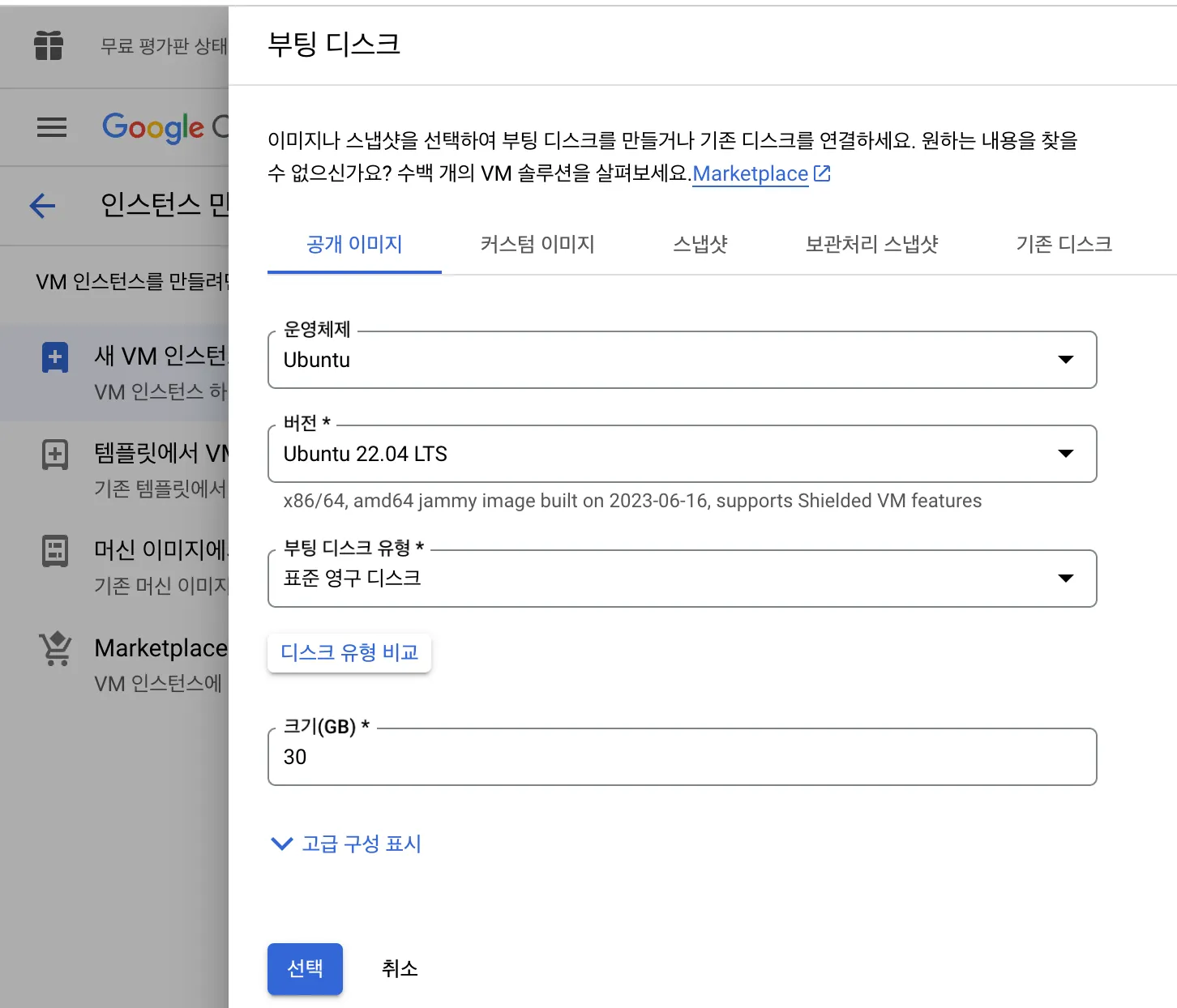 부팅 디스크 변경을 클릭해서 표준 영구 디스크를 선택하고 30GB이하로 설정합니다. 이미지는 원하시는 리눅스를 선택하시면 됩니다.