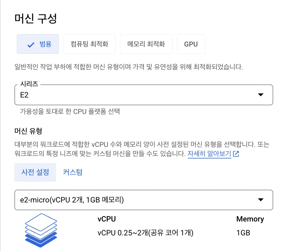머신 구성은 범용, 머신 시리즈는 E2, 머신 유형은 e2-micro(vCPU 2개, 1GB 메모리)로 설정합니다.