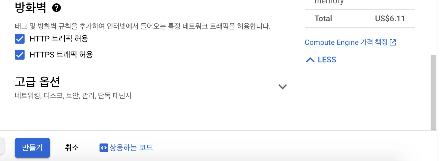 외부 접속을 위해서 HTTP, HTTPS 트래픽 허용을 클릭해주고 만들기 클릭!