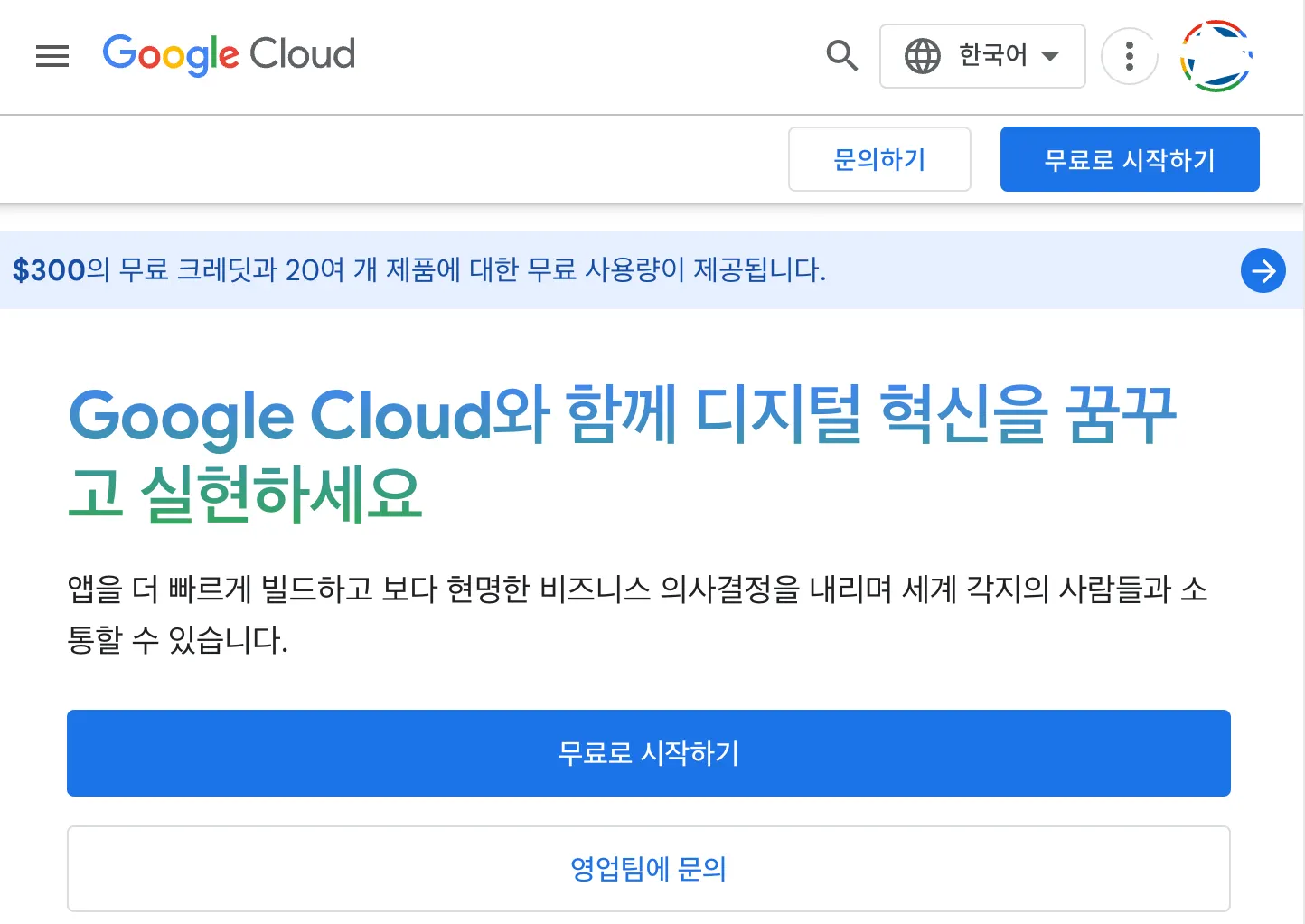 먼저 구글클라우드 홈페이지에 접속하여 무료로 시작하기를 눌러줍니다.