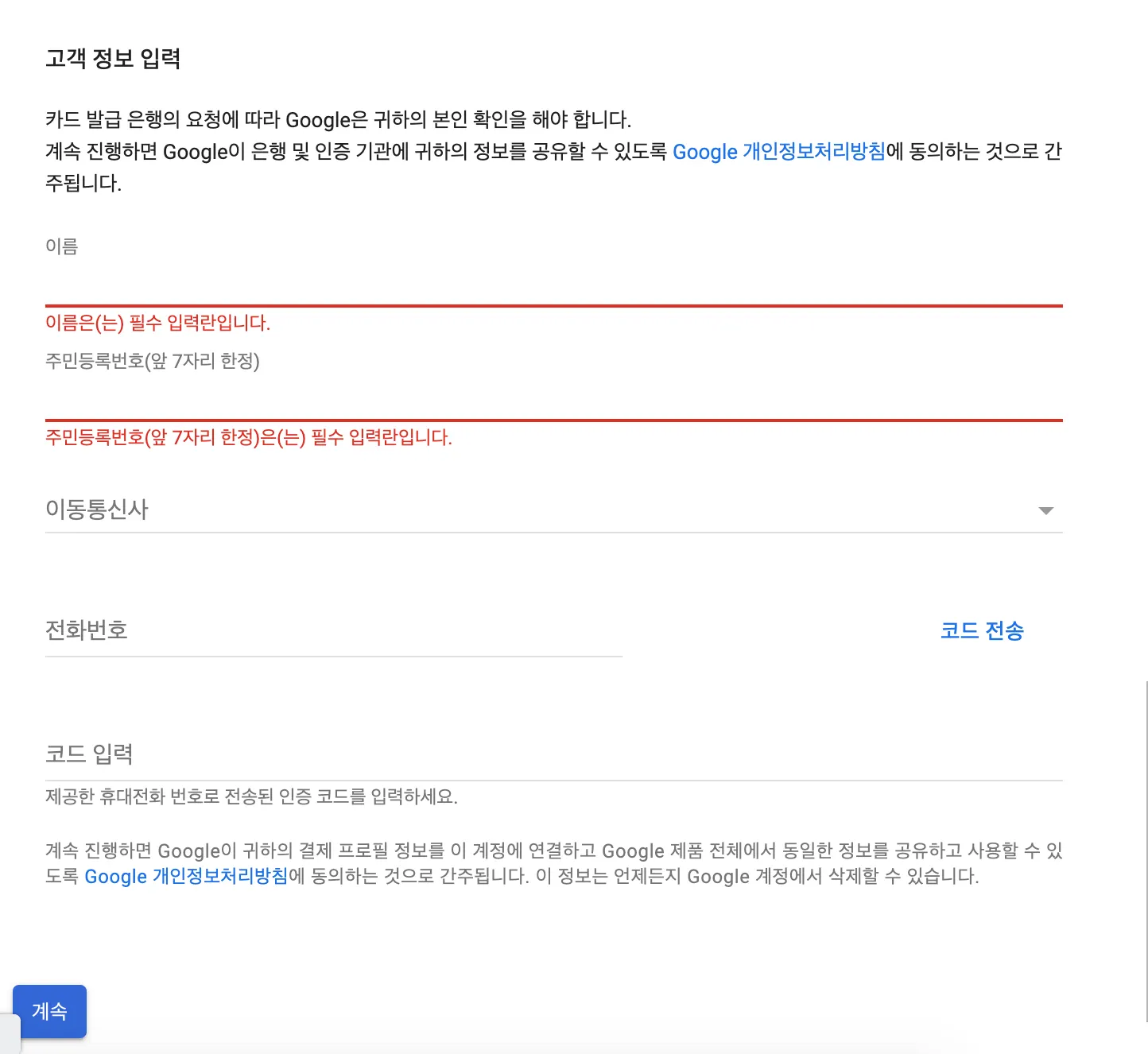 주소를 비롯한 정보 등록과 함께 핸드폰인증이 필요합니다.