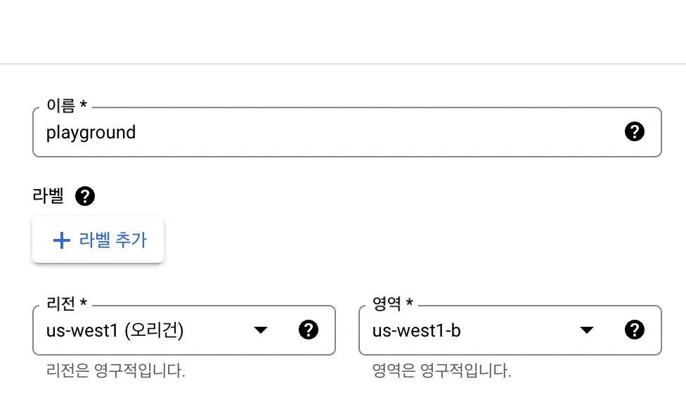 이름을 적어주시고 오리건: us-west1, 아이오와: us-central1, 사우스캐롤라이나: us-east1 중에 하나로 리전을 정합니다. (한국과 가까운 오리건을 추천드리고, 영역은 a, b, c 아무거나 괜찮습니다.)