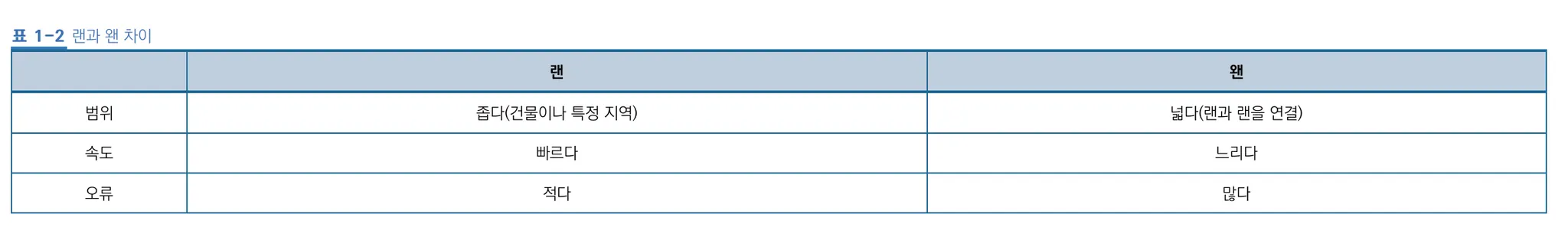 랜은 연결하는 거리가 짧은 만큼, 신호가 약해지거나 오류가 발생할 확률도 매우 낮다. 반면, 왠은 멀리 떨어져 있는 랜과 연결되어 있어서, 신호가 약해지거나 오류가 발생할 확률이 더 높아진다.
