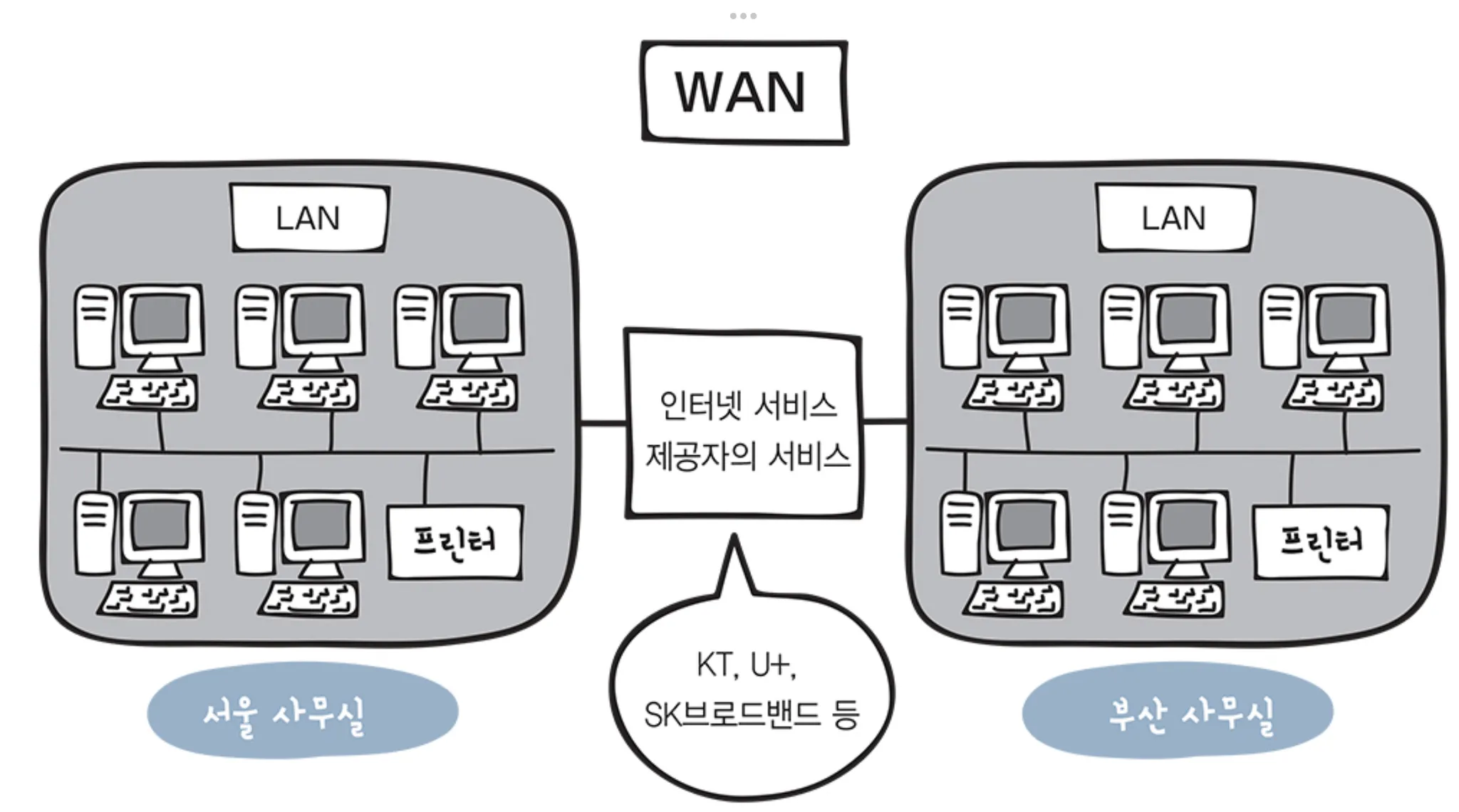 네트워크에는 랜이라고 하는 좁은 범위의 네트워크와 왠이라고 하는 넓은 범위의 네트워크가 있다.