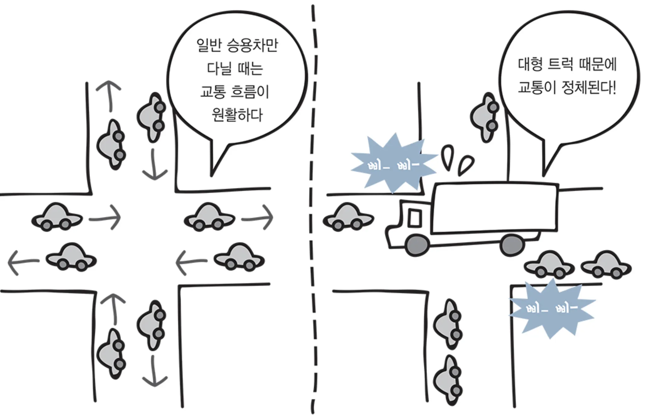 큰 데이터를 그대로 보내면, 마치 도로망에 대형 트럭이 차선을 모두 점령해 버린 것처럼 교통 정체가 일어나게 되고, 일반 승용차들은 움직일 수 없게 된다.