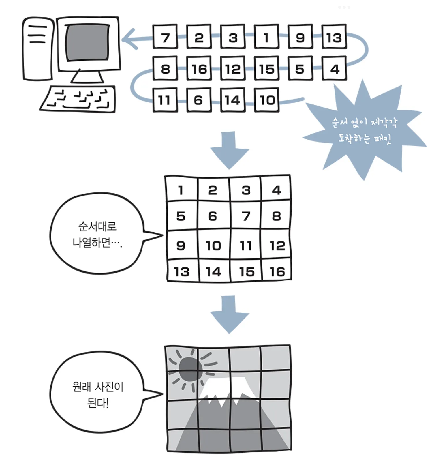 일단 큰 용량의 사진은 모두 작은 패킷으로 만든다. 이 패킷 만으로는 목적지에 도착하더라도 원래의 사진을 볼 순 없으므로, 목적지에 도달하면 패킷에서 원래 사진대로 되돌리는 작업을 해야한다. 일단 목적지로 보낸 패킷이 전송한 순서대로 도착하지 않을 수도 있고, 패킷이 전송 될 때 네트워크가 지연되어서 늦게 도착하거나 패킷이 누락 되기도 한다.