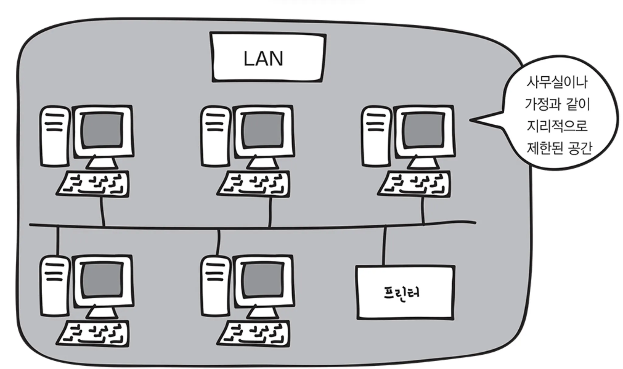 랜 : 비교적 가까운 거리에 위치한 장치들을 서로 연결한 네트워크를 말한다. 집, 사무실, 학교 등의 건물과 같이 가까운 지역을 연결하는 네트워크다.