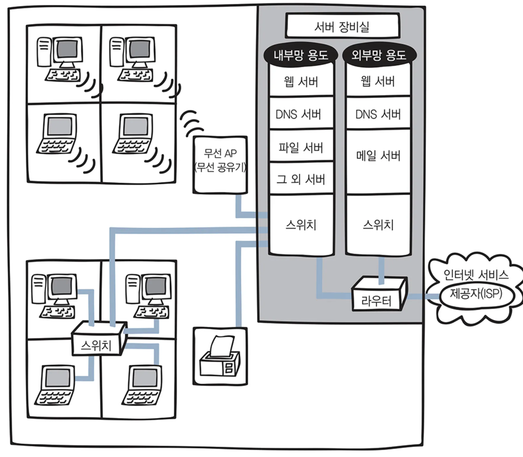 가정에서의 랜 구성과 눈에 띄게 다른 점은 DMZ(DeMilitarized Zone)라는 네트워크 영역이 있다는 점이다.