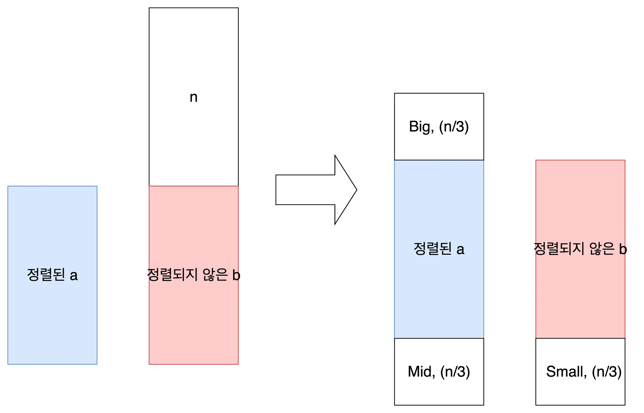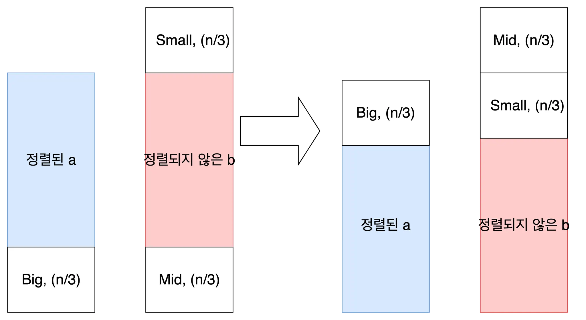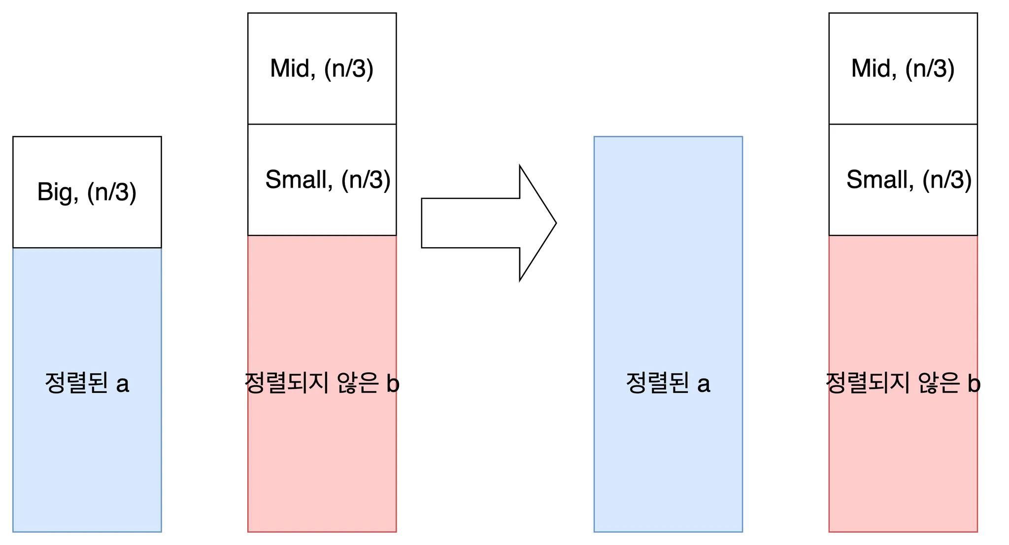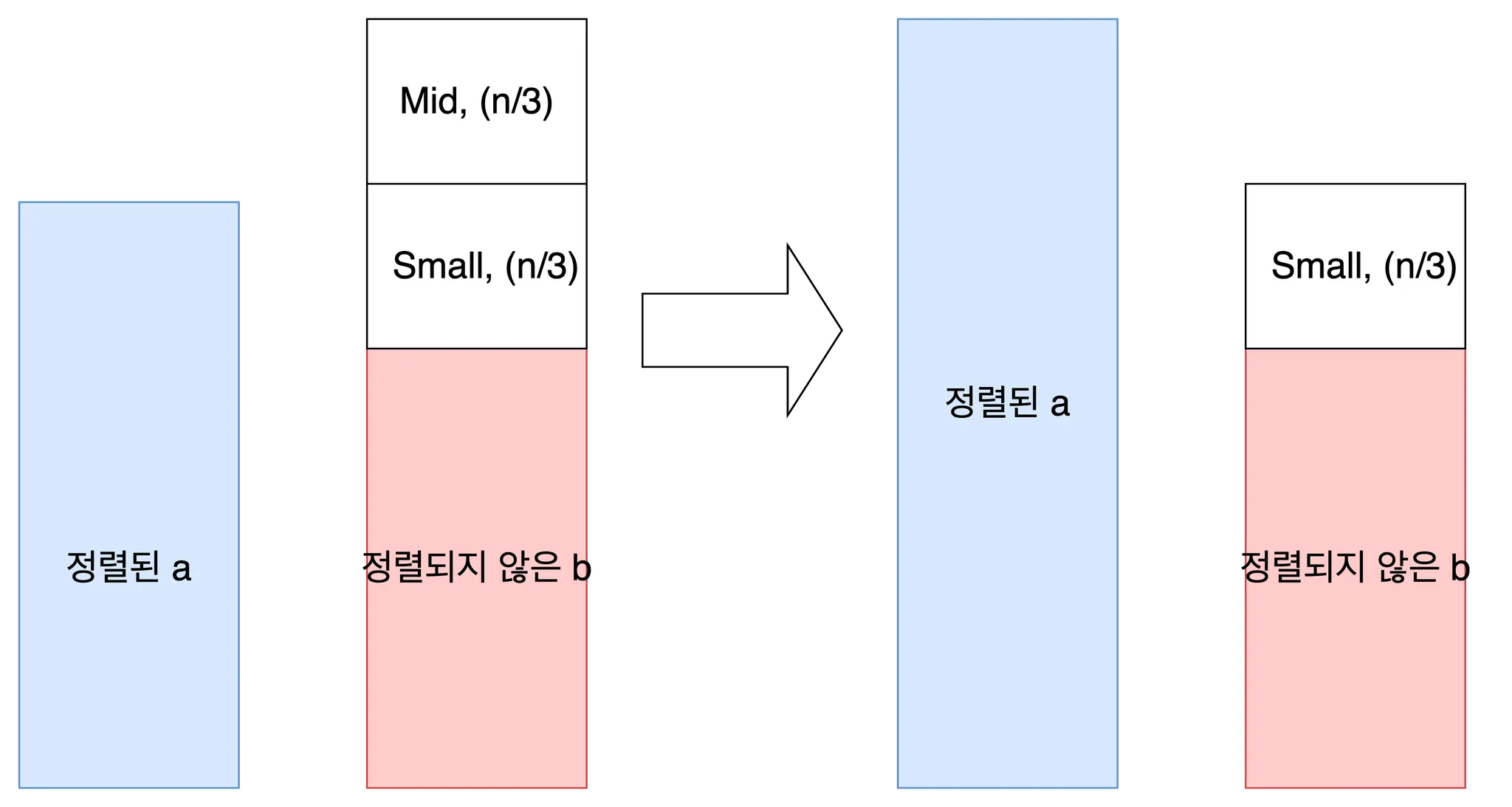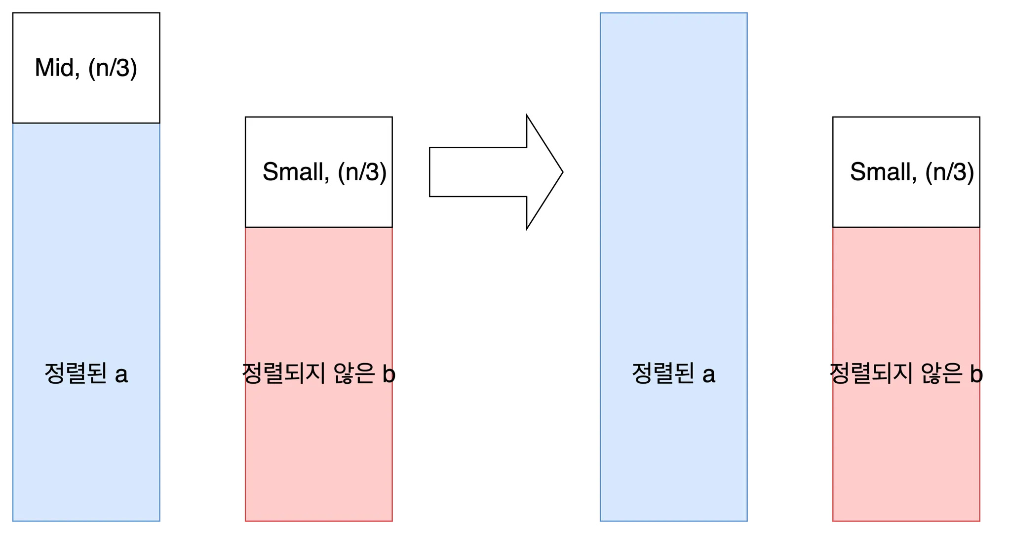 Mid에 대하여 재귀적으로 정렬하여 a의 상단으로 옮깁니다. Mid는 b의 상단에 n/3개만큼 존재하므로 그 비용은 B(n/3)입니다.