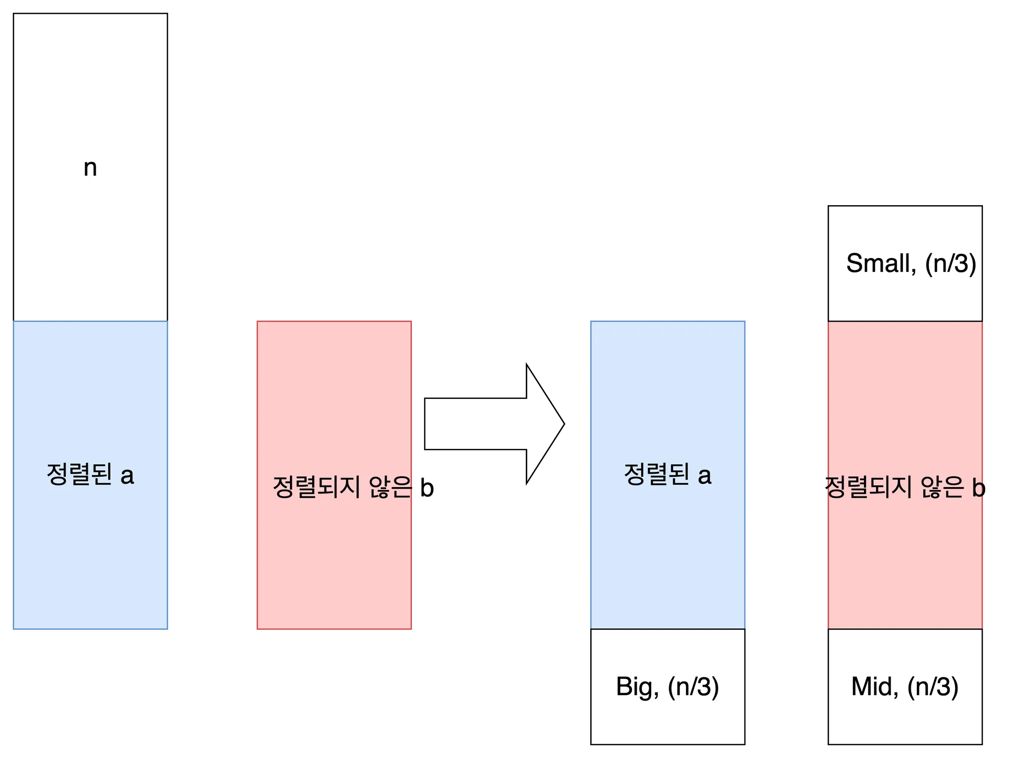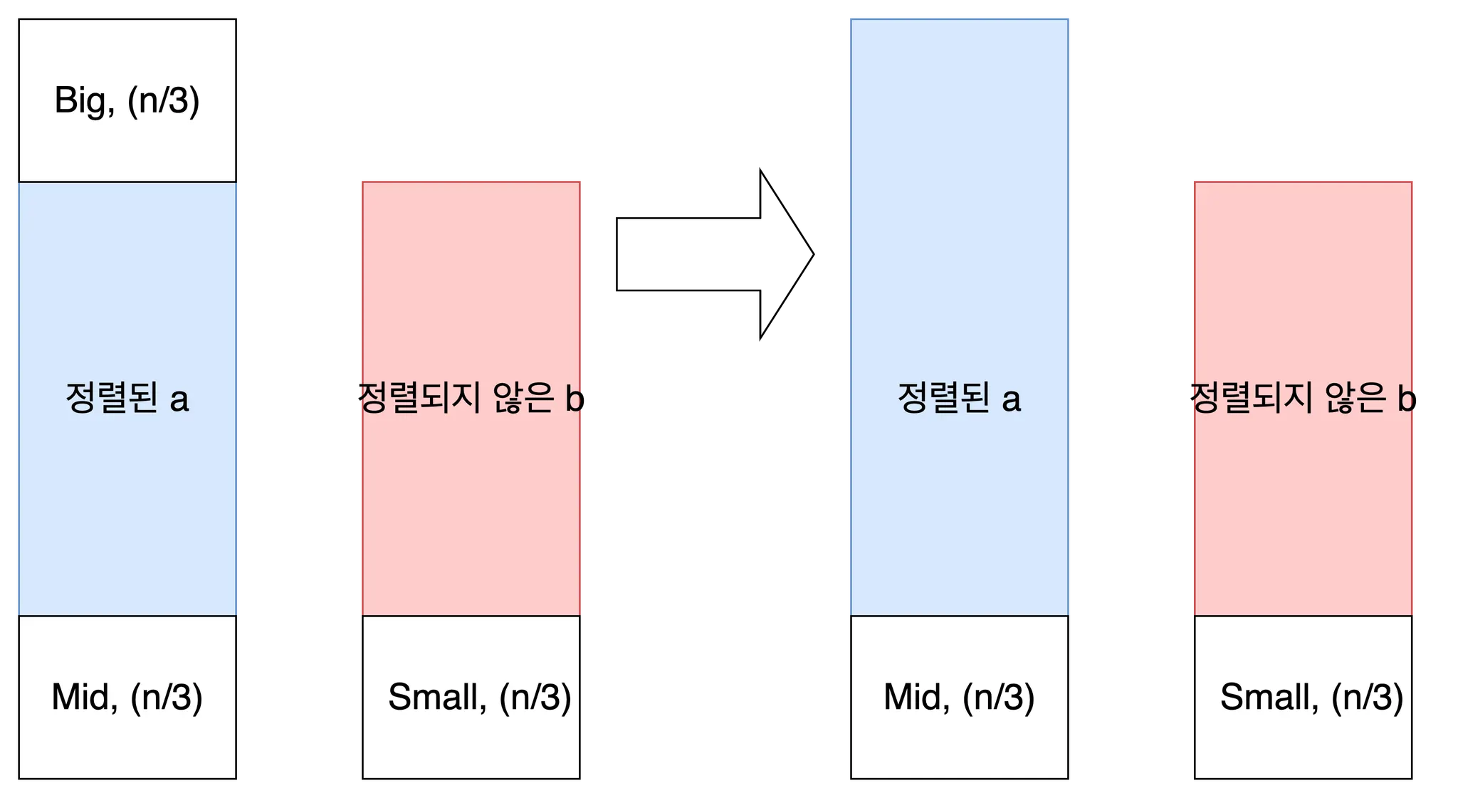 여기서 a의 상단에 위치한 Big에 대하여 재귀적으로 정렬을 수행합니다. Big은 a상단에 n/3개 만큼 위치하므로, 그 비용은 A(n/3)입니다.