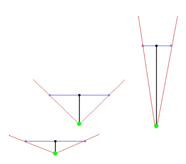 바깥쪽 선 두개는 스크린의 왼쪽/오른쪽 경계이고, 두 선 사이의 각도를 FOV (Field of View)라고 합니다.