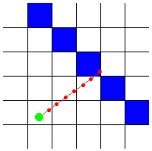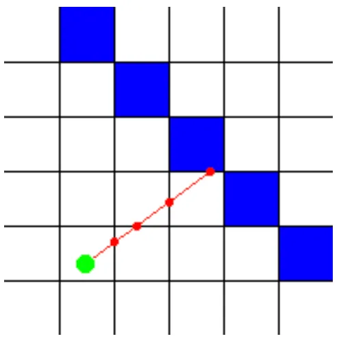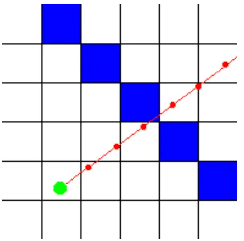 A human can immediatly see where the ray hits the wall, but it’s impossible to find square the ray hits immediatly with a single formula, because a computer can only check a finite number of position on the ray. Many raycasters add a constant value to the ray each step, but then there’s a chance that it may miss a wall! For example, with this red ray, its position was cheked at every red spot.
