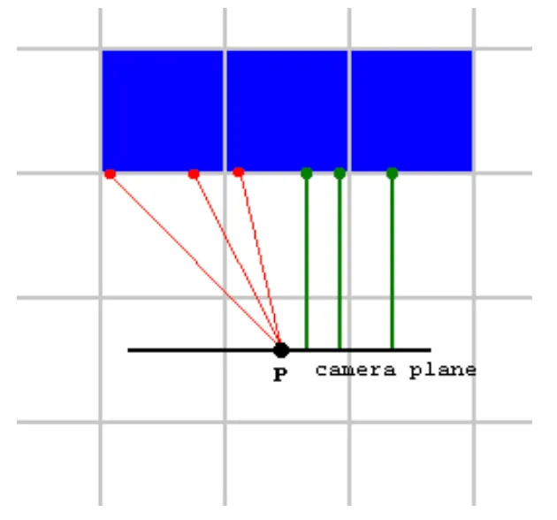 녹색 선은 벽의 적중지점에서 카메라 평면으로 바로 이동하는 광선을 나타냅니다.