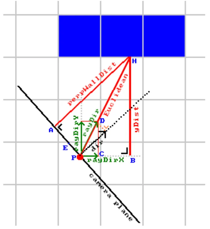 이러한 어안렌즈 효과를 피하기 위해, 플레이어 위치까지의 유클리드 거리 대신에, 카메라 평면까지의 거리를 사용할 것입니다.