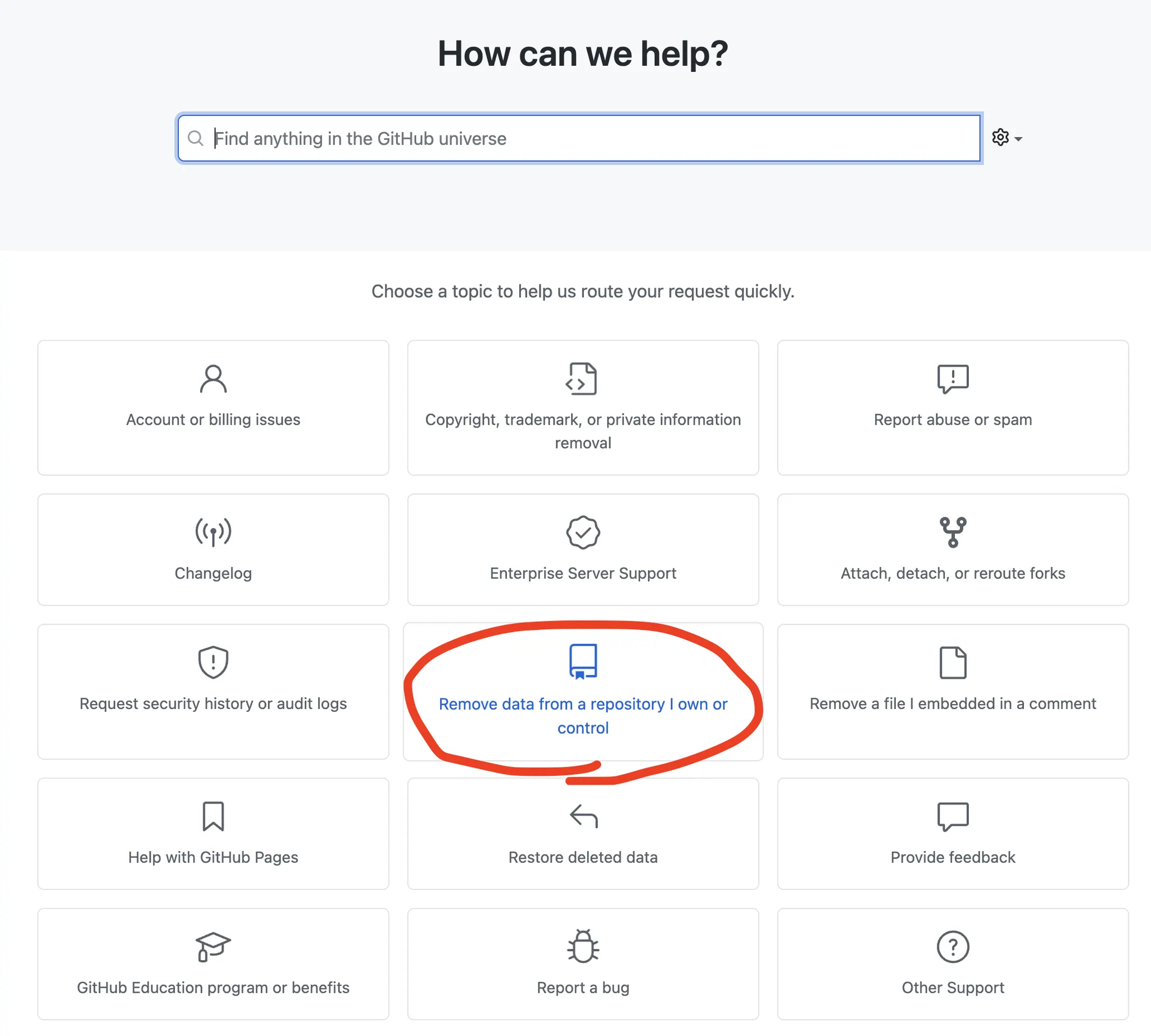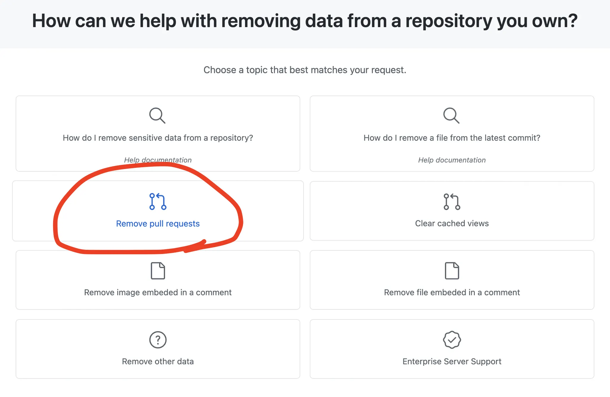 이중에서 저희는 PR을 지우는것이 목표이기 때문에, Remove data from a repository I own or control 메뉴로 들어갑니다.