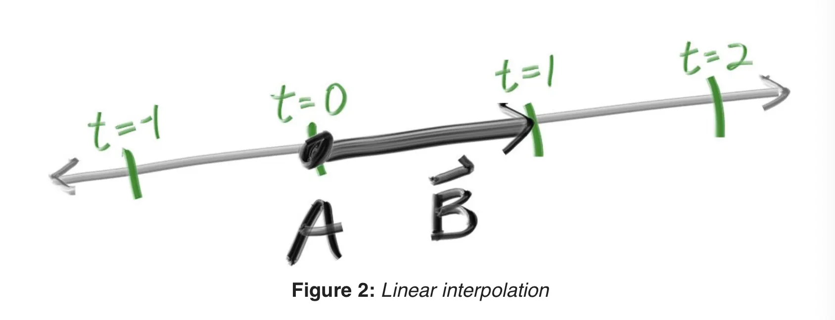 1차원 좌표계인 위의 그림을 보면 t = 0 인 좌표에서 t = 1인 좌표를 가리키는 크기가 1인 벡터가 있다. 우리는 여기서 벡터를 시작지점 + 크기 * 방향로 표현할 수 있다.