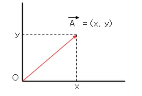 하지만 우리가 사용할 좌표계에서는 크기와 방향(즉, t와 b)를 바로 알기 어렵다. 우리는 좌표계를 활용해 벡터의 성분을 분해한 표기법을 사용할 것이다. 예를들면 아래의 벡터 A는 A(x, y) 로 표기할 수 있다.