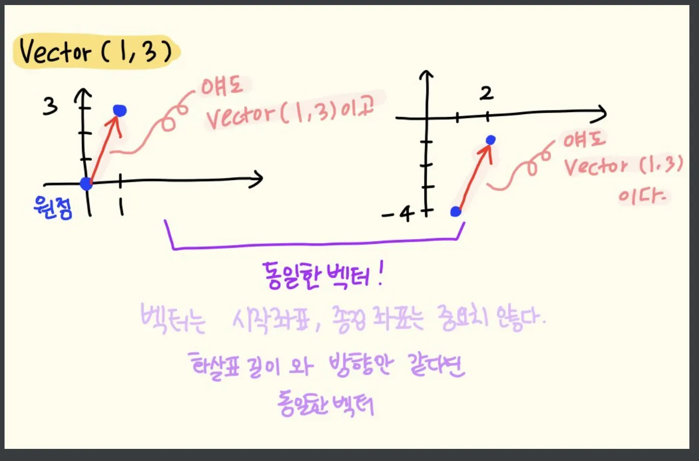 시작점, 종점과 상관 없이 벡터의 길이와 방향이 모두 같으면 같은 벡터이다!