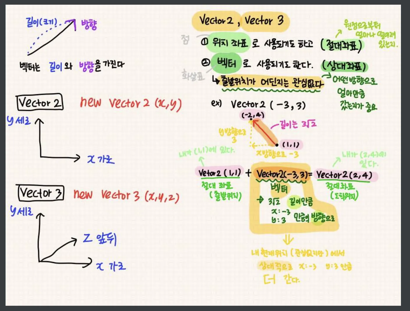 위치 좌표로서의 Vector2(2, 4)는 Vector2(0, 0) 원점을 시작점으로 했을 때 Vector2(2, 4)로 향하는 벡터라고도 할 수 있다.
