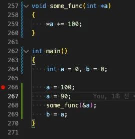 위 코드에서 디버거를 실행하면 266줄에서 코드실행이 멈춘 상태가 된다.