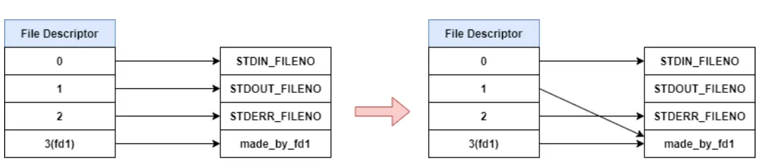 아래와 같은 코드가 있다면, dup2 함수를 실행하게 되면 아래 그림처럼 파일 디스크립터가 가리키고 있는 open file table의 값이 변한다.
