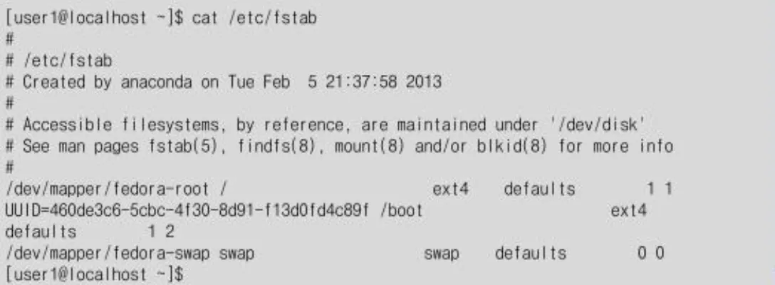 자동으로 마운트되게 하려면 /etc/fstab 파일에 설정해야 한다. 해당 파일은 파일 시스템의 마운트 설정 정보를 가지고 있다.