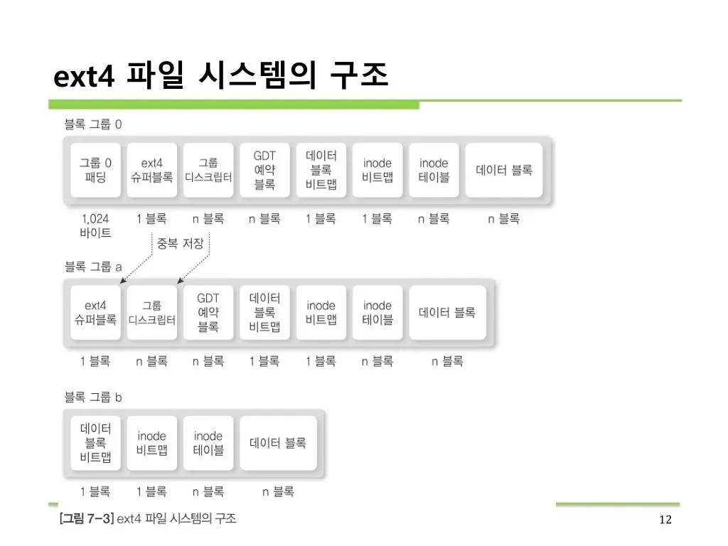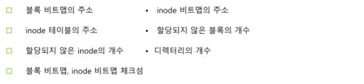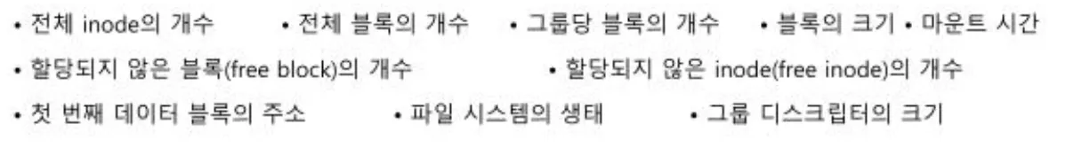 슈퍼 블록 : 파일 시스템과 관련된 다양한 정보가 저장된다. 슈퍼 블록에 문제가 생기면 전체 파일 시스템을 사용할 수 없게 된다. 따라서 슈퍼 블록은 복사복은 만들어 두고 필요한 경우 이를 사용하여 복구한다.