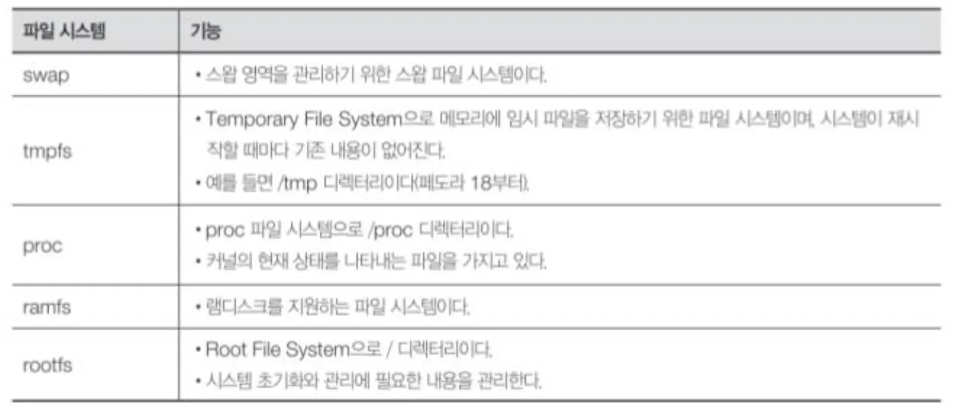 디스크가 아닌 메모리에 생성되어 사용되는 가상 파일 시스템으로 특수한 용도를 가지고 필요에 따라 생기거나 없어진다.