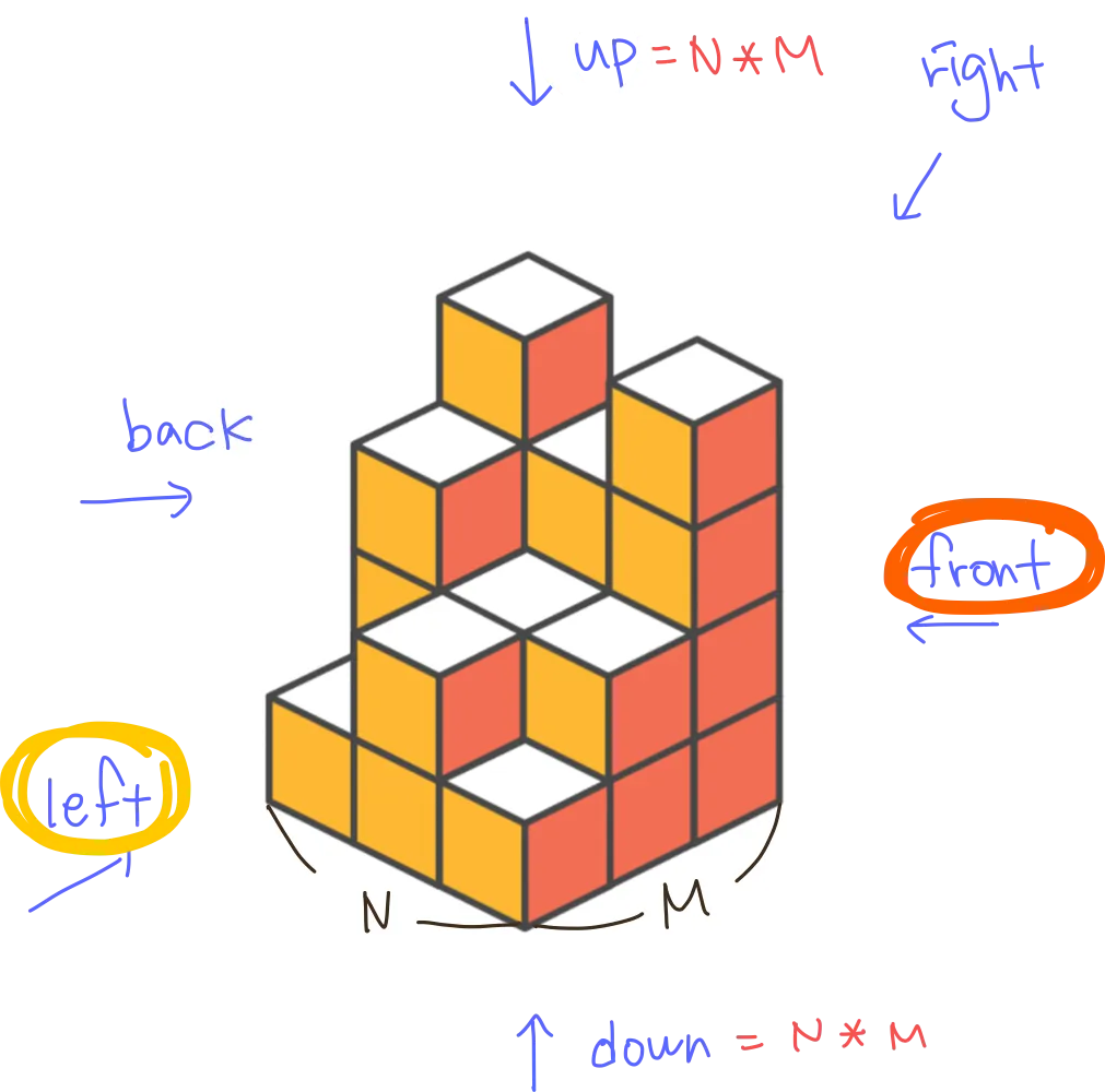 겉넓이를 구하기 위해서는 입체도형의 up, down, front, back, left, right 에서 보이는 사각형들의 합을 구하면 된다